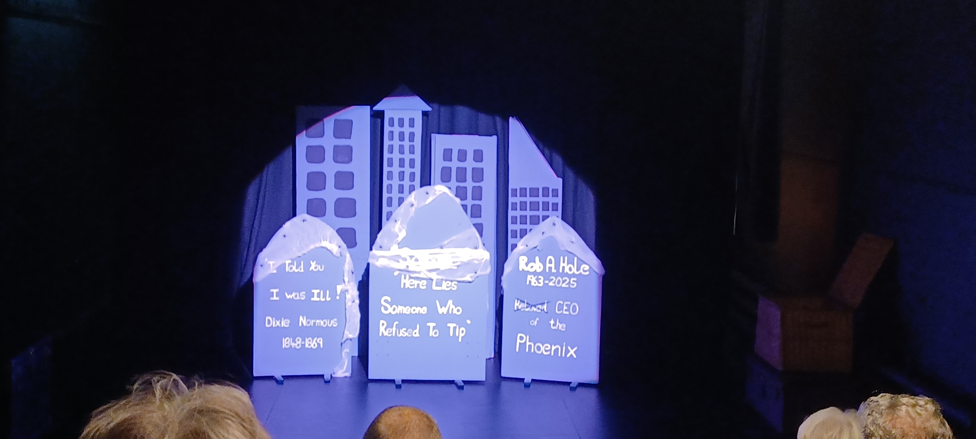 The Phoenix Theatre engaged the help of the Bordon Men’s Shed to construct scenery for their production of Screw-ged, a naughty version of the old panto. They asked to make some headstones for the graveyard and New York-style skyscrapers for the background. Over the last few weeks, we have been busy working in our new workshop to produce these items, which were then used on the stage in the production.